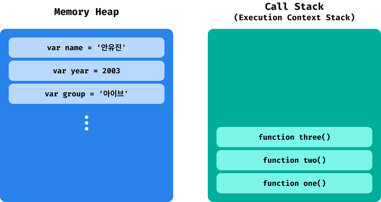 자바스크립트는 싱글 스레드 프로그램이다. 스레드가 1개 있다는 뜻이다. 싱글 스레드 안에는 한 개의 Memory Heap과 한 개의 Call Stack(Execution Context Stack) 이 존재한다.